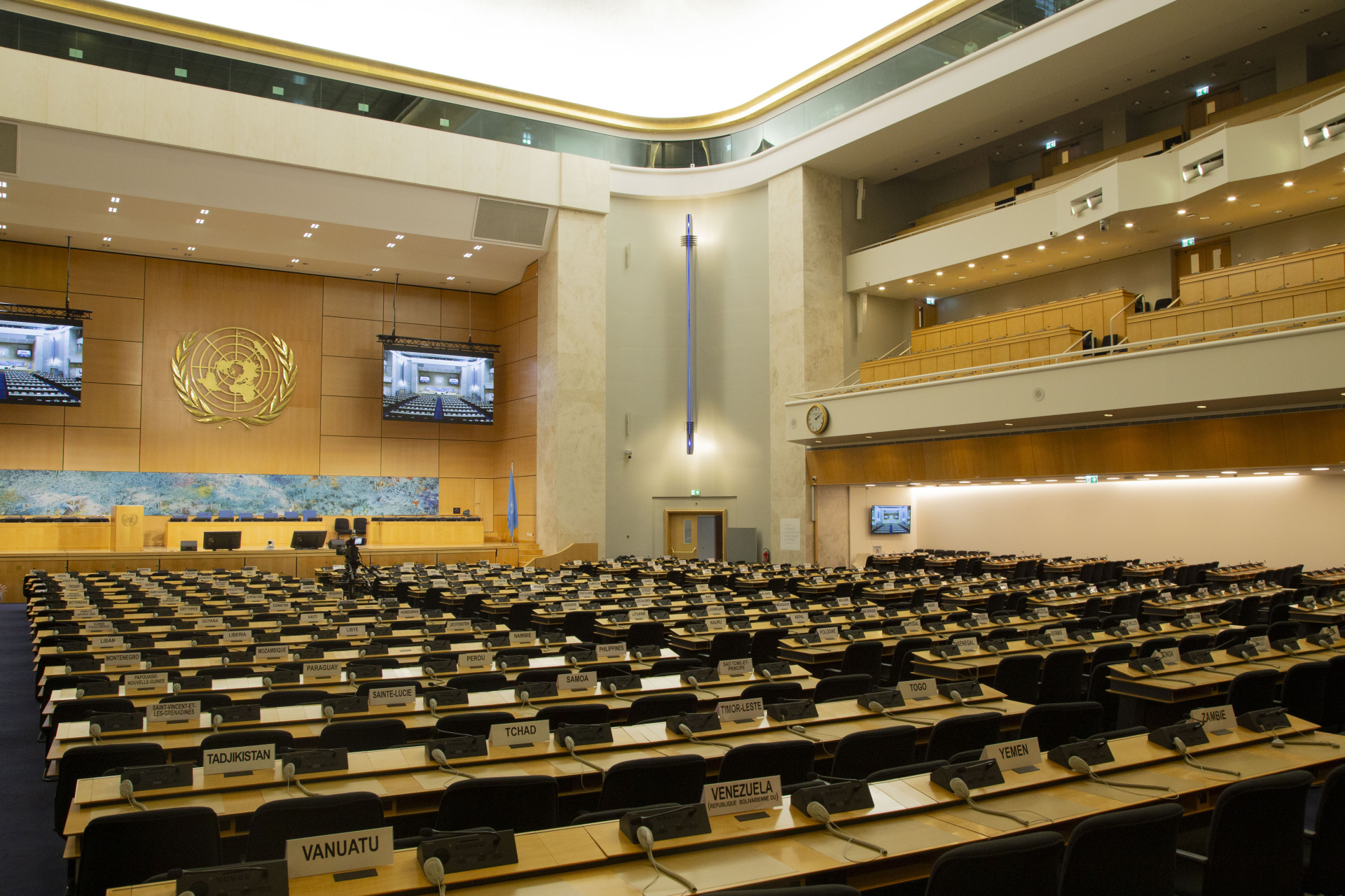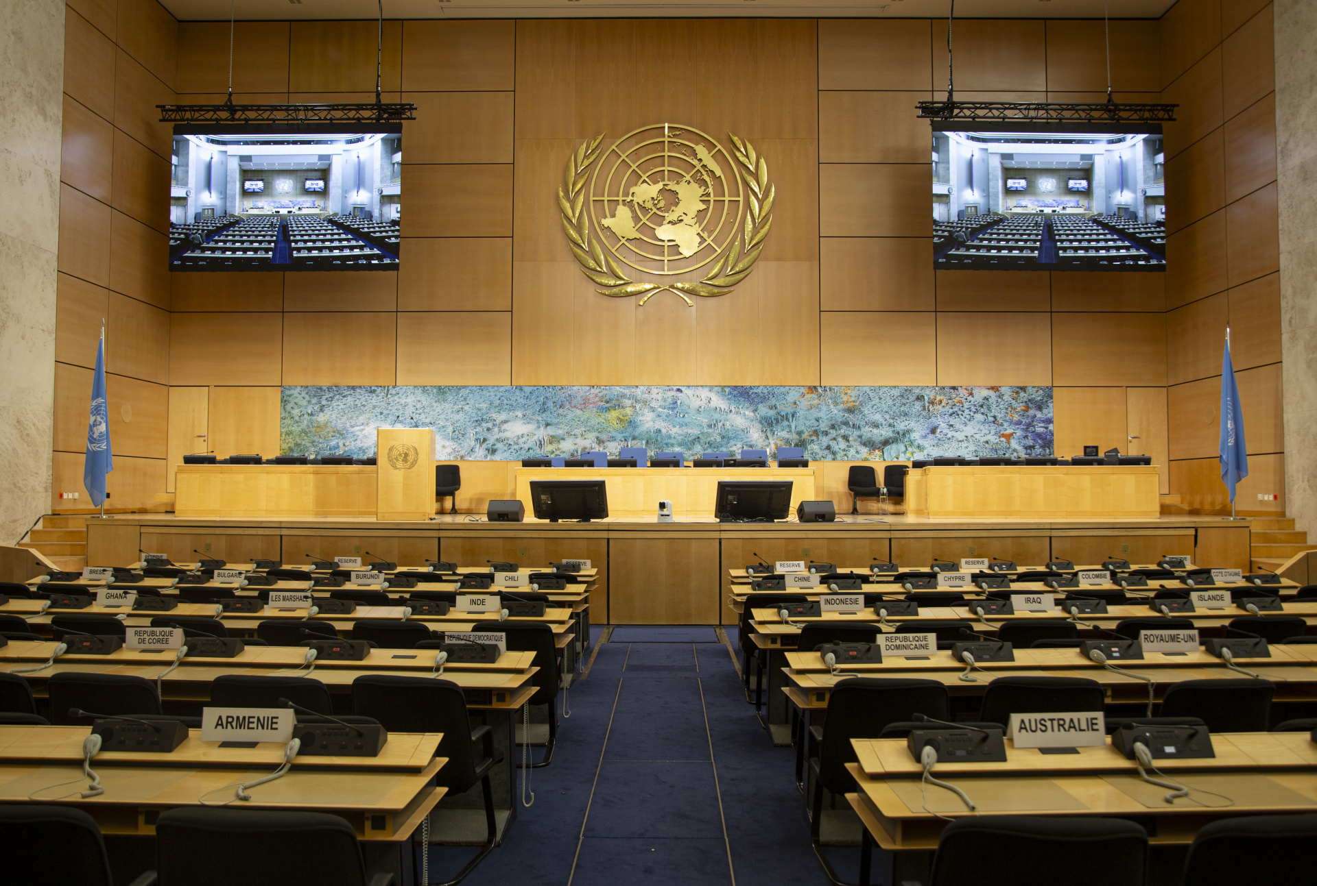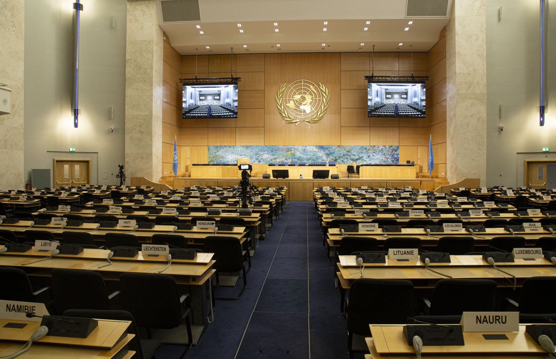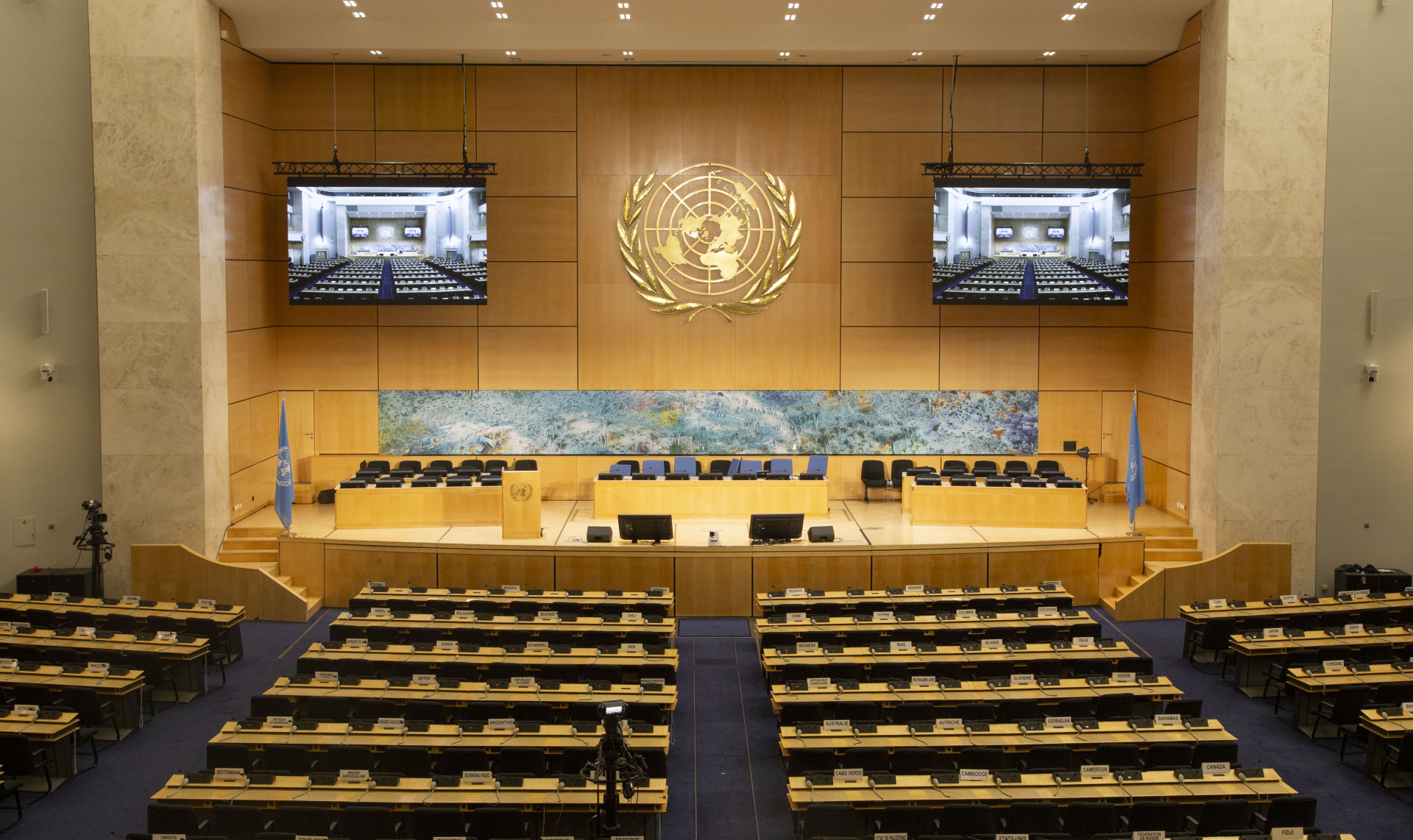 El Salón de Asambleas fue también la primera estancia que se equipó con un sistema de interpretación simultánea, que fue donado por los Estados Unidos de América. El 25 de septiembre de 1937, durante el 18º período de sesiones de la Asamblea, se inauguró el Salón de Asambleas sin las famosas cuatro pinturas, que no se terminaron hasta finales de julio de 1938.